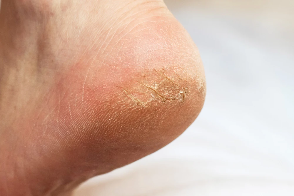 A falta de hidratação adequada e o uso de calçados inadequados também contribuem para o ressecamento e rachaduras na pele dos pés.